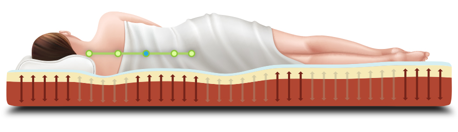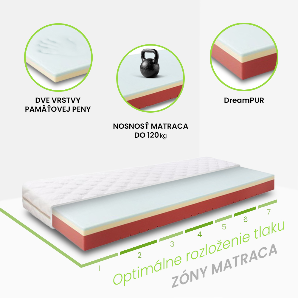 ✔ Dve vrstvy pamäťovej peny memoDreamPUR – mäkšia vrchná vrstva (2 cm) pre komfort a tvrdšia druhá vrstva (4 cm) pre stabilnú oporu chrbtice.