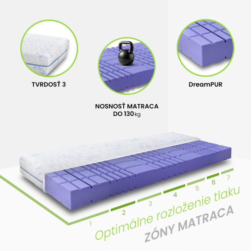✔ Ortopedická DreamPUR pena (18 cm) – vysoko elastická a tvarovo stála pena poskytuje rovnomernú oporu chrbtici a zmierňuje tlak na svaly a kĺby.
