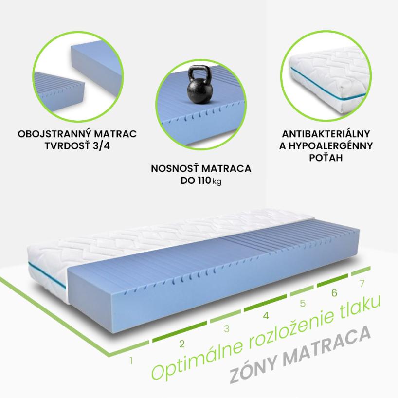 ✔ Obojstranný matrac s rozdielnou tvrdosťou 3/4 – možnosť výberu medzi stredne tvrdou a tvrdou stranou pre individuálne pohodlie.